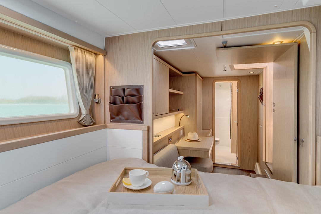 Lumina naturala care patrunde prin geamurile generoase ale cabinelor face spatiul sa para mai mare si mai confortabil. In partea din spate a fiecaruia dintre cele doua flotoare se afla cate o platforma de baie, dotata cu scarita pentru coborarea in apa, iar in partea din fata a catamaranului se gaseste locul de plaja ideal, pe plasa dintre ele.